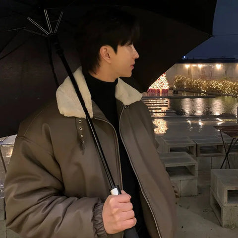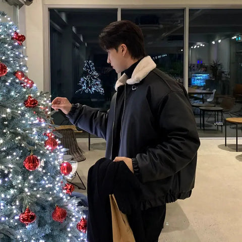 Lamb Wool Lapel Men's Trendy Brand Pi Shuai PU Leather Down Jacket 2024 New Winter American Bread Coat Work Jacket