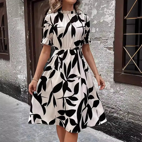 Europe And America Explosions Short-sleeved Ruffled Plant Printed Large Skirt Waist Dress