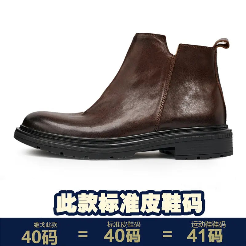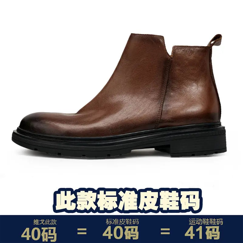 Step up your style with these autumn/winter men’s genuine leather Martin boots, featuring a round toe, thick sole, zipper design, and retro Chelsea boot flair—perfect for any rugged or casual look.
